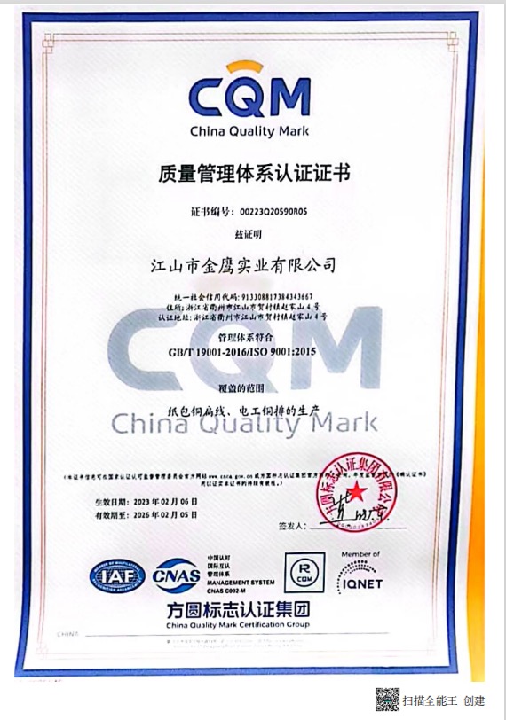 江山市金鷹實(shí)業(yè)有限公司,地處江山市賀村工業(yè)園區(qū)趙家山4-1號,占地面積18000M2,建筑面積約15000 M2。原主要生產(chǎn)、銷售“金鷹、金盾、JYD”系列地彈簧產(chǎn)品,是國內(nèi)唯一二次參與制訂地彈簧國家標(biāo)準(zhǔn)的專業(yè)生產(chǎn)廠。企業(yè)曾榮獲“省級先進(jìn)企業(yè)、文明單位”等殊榮。所生產(chǎn)的系列地彈簧產(chǎn)品,被國家及省有關(guān)部門評定為“省優(yōu)產(chǎn)品、質(zhì)量信得過放心產(chǎn)品、高標(biāo)準(zhǔn)嚴(yán)要求制造產(chǎn)品”等稱號。并于2002年通過了“ISO9002方圓質(zhì)量體系認(rèn)證”。隨著國內(nèi)用電水平的不斷提高及高低壓電網(wǎng)改造的需要,公司及時捕捉市場對電工銅排和紙包繞組銅扁線需求的機(jī)遇。通過自籌資金,改建廠房,新購成套先進(jìn)生產(chǎn)、檢測設(shè)備。建成了目前國內(nèi)自動化程度最高,加工精度最優(yōu)的電工銅排和紙包繞組銅扁線生產(chǎn)線。